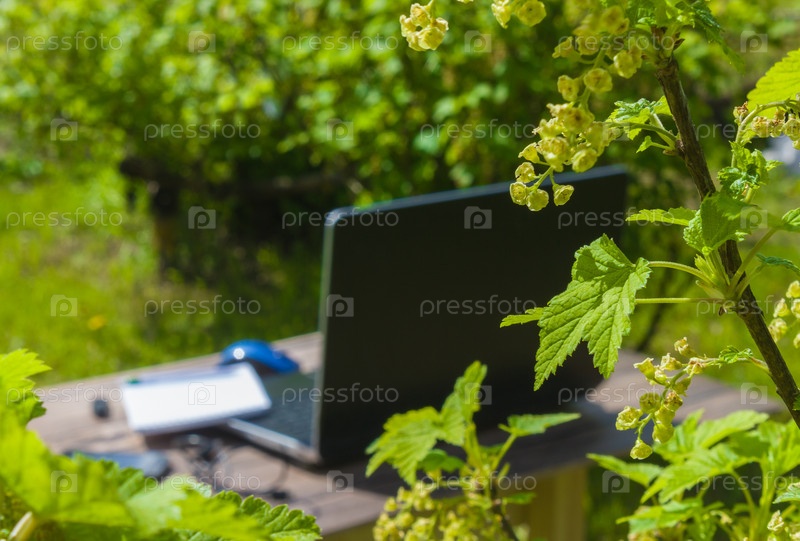 Работа на ноутбуке на открытом воздухе. Смартфон, блокнот и ручка. Работа вне офиса в вашем саду. Фриланс