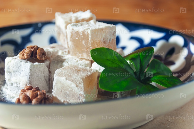 Кубики рахат-лукума на национальной узбекской тарелке с грецкими орехами. Съемка крупным планом