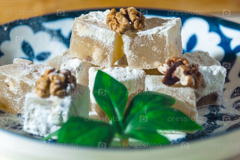 Кубики рахат-лукума на национальной узбекской тарелке с грецкими орехами. Съемка крупным планом