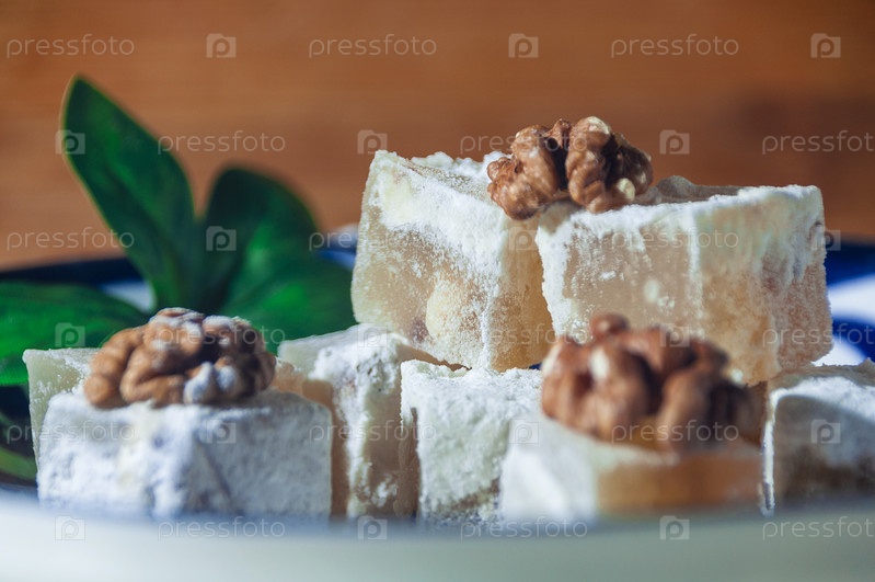 Кубики рахат-лукума на национальной узбекской тарелке с грецкими орехами. Съемка крупным планом