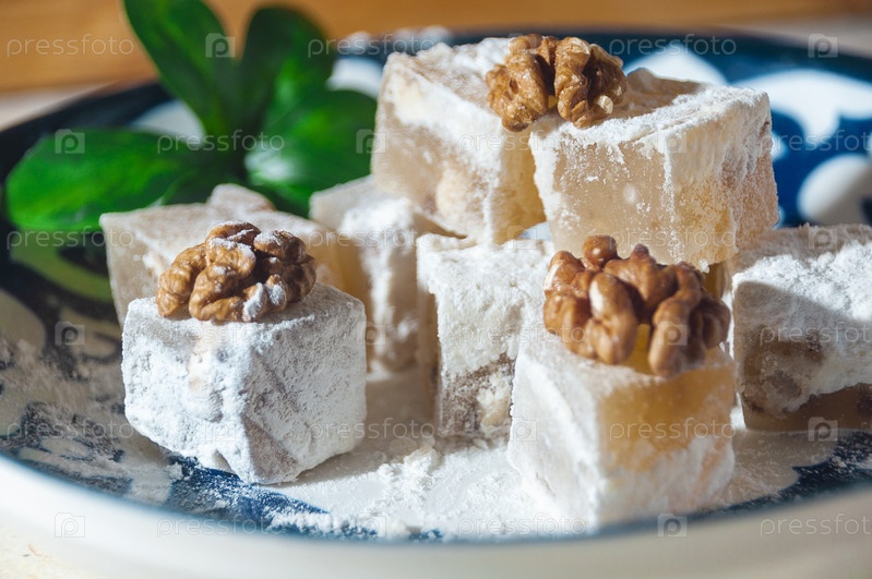 Кубики рахат-лукума на национальной узбекской тарелке с грецкими орехами. Съемка крупным планом