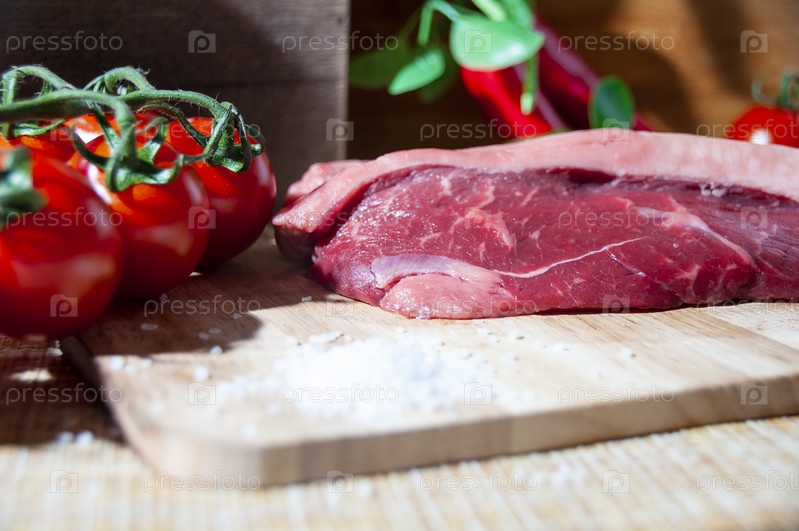Кусок сырой свежей говядины на деревянной доске со специями и овощами
