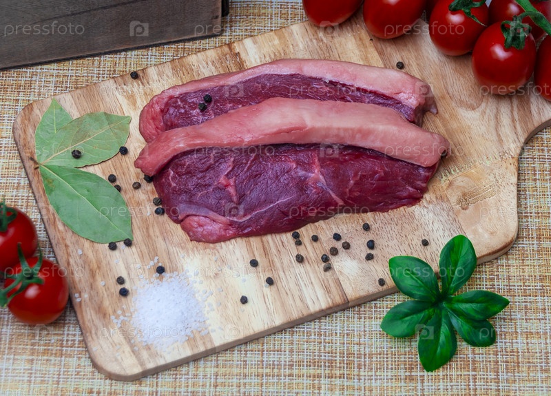 Кусок сырой свежей говядины на деревянной доске со специями и овощами