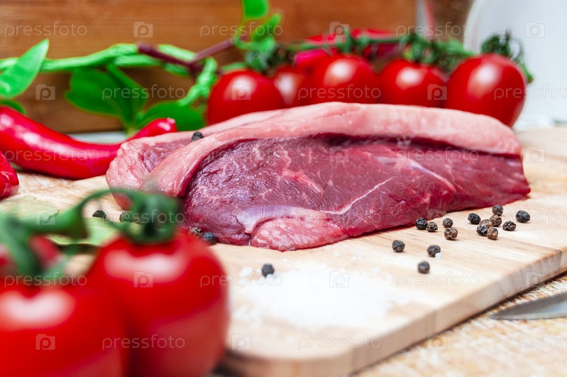 Кусок сырой свежей говядины на деревянной доске со специями и овощами