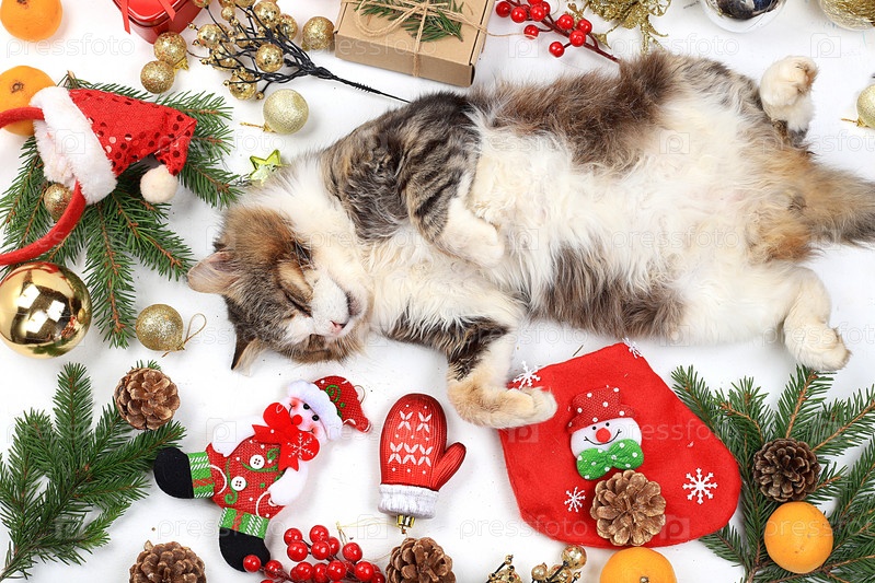 Забавный пушистый кот спит на рождественском столе среди мандаринов, игрушек, еловых веток и украшений, концепция уютного дома и нового года, праздничная открытка, фон, избирательный фокус