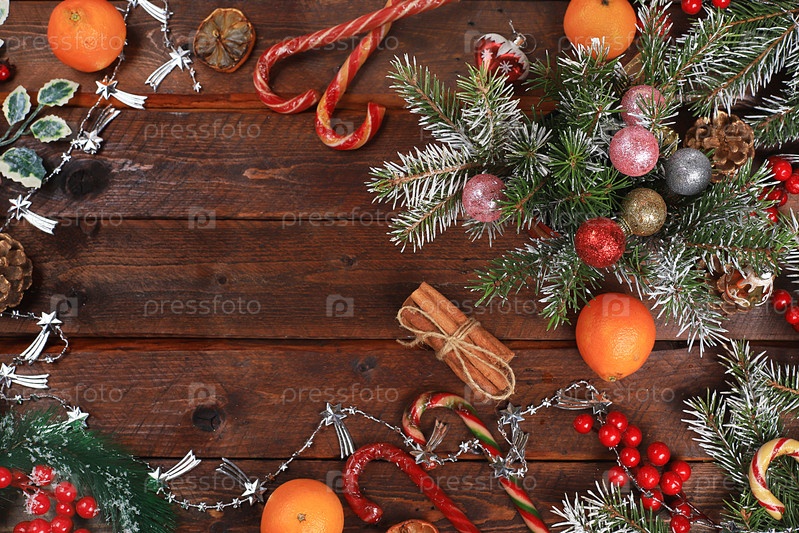 Рождественская композиция, открытка, баннер для показа, фон с Новым 2021 годом с еловыми ветками с игрушками, украшениями и мандаринами, презентация продукта для праздничной рекламы, место для текста, выборочный фокус
