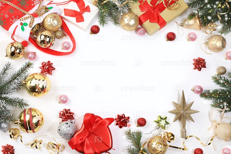 Рождественский фон и новогодняя концепция, рамка из еловых веток, подарочные коробки и красивые праздничные украшения, открытка, зимний баннер, место для текста, выборочный фокус