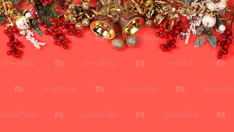 Рождественская композиция и концепция нового 2023 года, красивые праздничные украшения на красном фоне с яркими лентами, открытка, баннер зимнего экрана с местом для текста, выборочный фокус