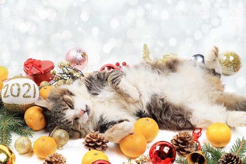 Забавный пушистый кот спит на рождественском столе среди мандаринов, игрушек, еловых веток и украшений, концепция уютного дома и нового года, праздничная открытка, фон, избирательный фокус