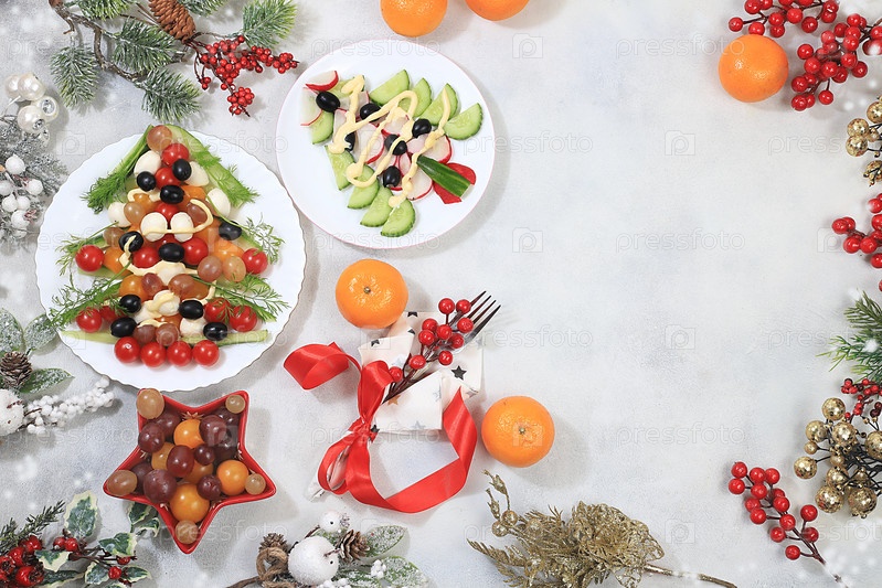 Рождественская новогодняя еда, концепция детокс-диеты, традиционные праздничные мандариновые и овощные салаты, идея дизайна продуктов питания, плоская планировка, избирательный фокус