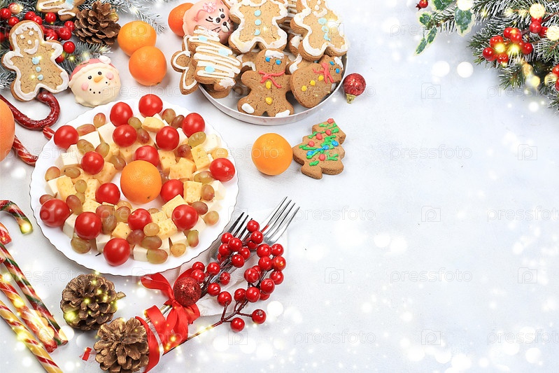 Рождественские новогодние блюда, традиционный праздничный салат из сыра, мандаринов, винограда и меда, для веганской еды, еловые ветки, шишки и украшения, идея дизайна продуктов питания, место для рецепта, плоская планировка, выборочный фокус