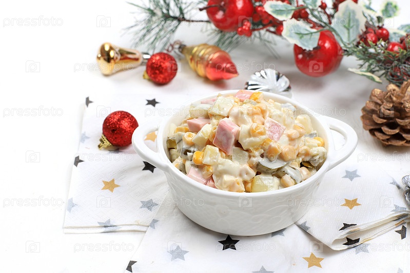 Рождественская новогодняя еда, традиционный праздничный салат оливье с еловыми ветками и шишками и украшениями на светлом столе, идея дизайна блюд, выборочный фокус