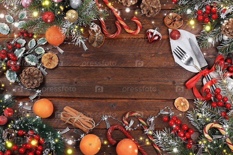 Рождественская новогодняя рамка из мандаринов, еловых веток, шишек и украшений, концепция приготовления праздничной еды, место для рецепта, плоская планировка, выборочный фокус