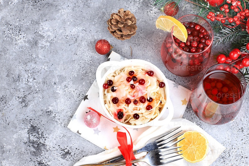 Квашеная капуста с клюквой и крепким алкогольным коктейлем из специй, здоровый натуральный салат для детокс-диеты и согревающий зимний напиток, рождественская праздничная еда, зимняя композиция, избирательный фокус