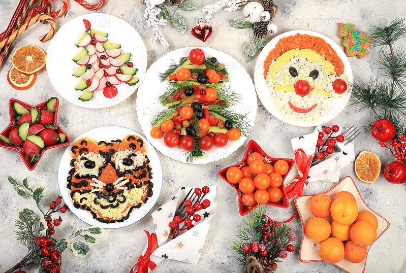 Рождественские новогодние блюда, традиционный праздничный салат из тигренка, символ года, салат оливье, мандариновая и виноградная елочка, еловые ветки и украшения, идея дизайна продуктов питания, плоская планировка, выборочный фокус