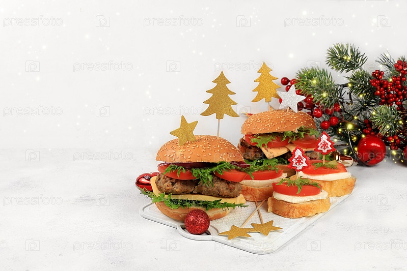 Рождественские новогодние блюда, рождественские бургеры на праздничном столе с живой елкой и украшениями, новогодняя еда. Рекламный баннер для кафе или магазина, выборочный фокус