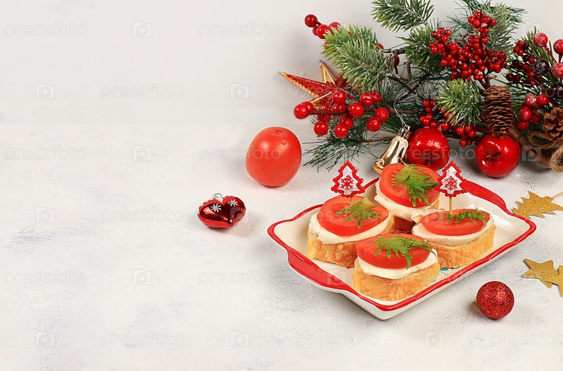 Новогодние рождественские блюда, тосты капрезе брускетта с сыром моцарелла, помидоры черри и салат из свежих овощей. Традиционная итальянская еда, здоровый натуральный завтрак с живой елкой и украшениями, новогодняя еда. Рекламный баннер для кафе или мага