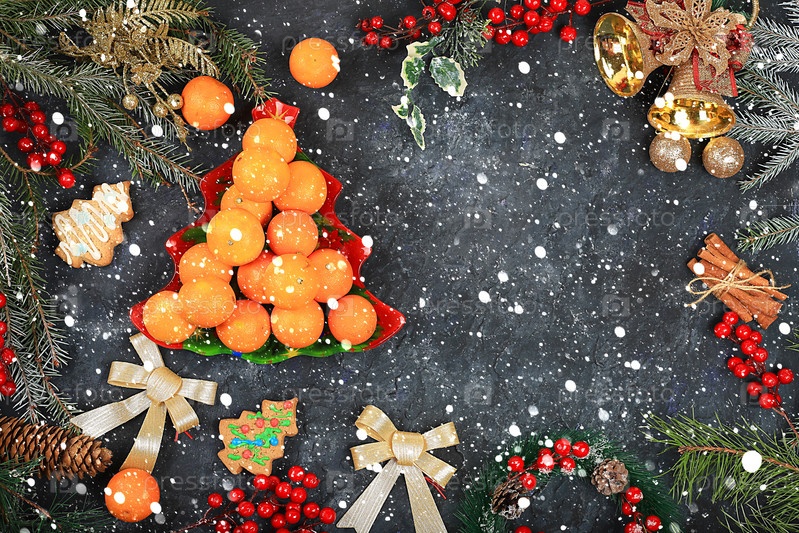 Рождественская новогодняя рамка из мандаринов, еловых веток и шишек, пряничного человечка и украшений, концепция приготовления праздничной еды, место для рецепта, плоская планировка, выборочный фокус