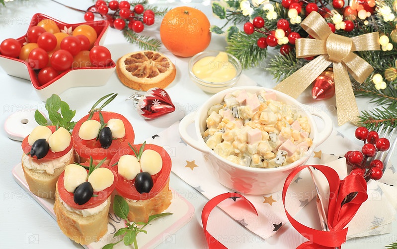 Рождественские новогодние блюда, для традиционного праздничного салата с сыром, помидорами, оливками и виноградом и капрезе брускетта, салат оливье, еловые ветки и украшения, идея дизайна продуктов питания, выборочный фокус