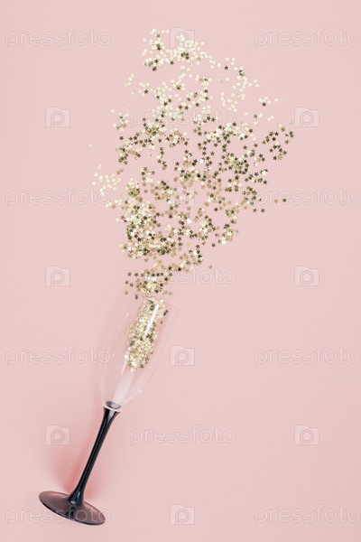Бокал шампанского вылил конфетти золотыми звездами