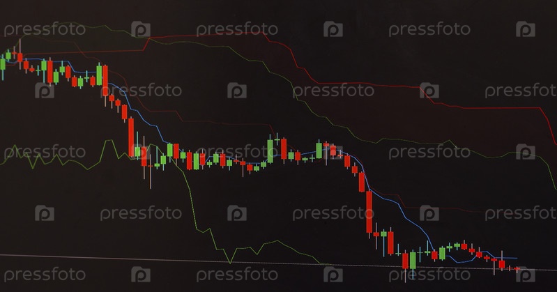 Биржевой график с индикаторами, показывающими падение рынков во время кризиса. График фондового рынка. Свечной график. Финансовая диаграмма на темном фоне представляет собой финансовый кризис, крах