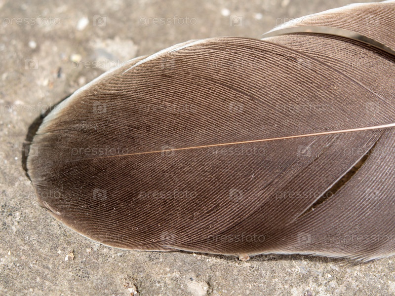 Крупный план птичьего пера. Коричневое перо на бетонной поверхности