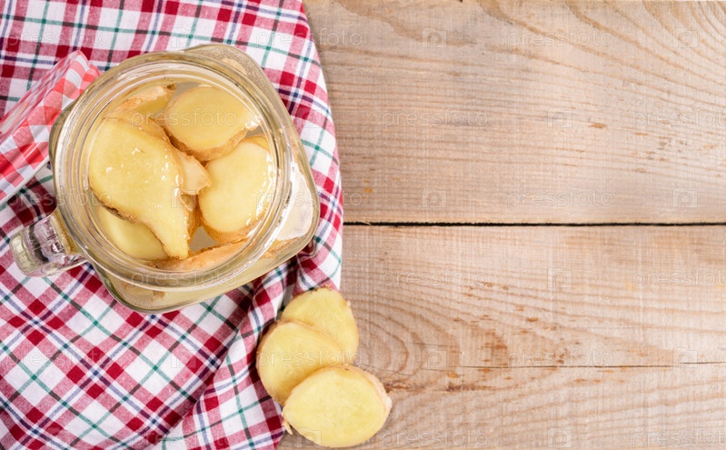 Открытая стеклянная банка с имбирной водой на красной клетчатой ткани на деревянных досках