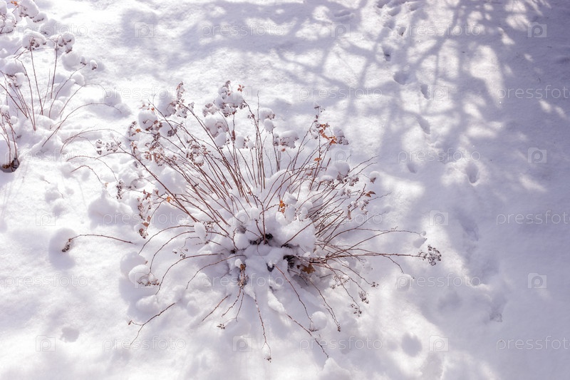 Зимний пейзаж поля с сушеным травяным кустом и модными ажурными тенями. Красивый рождественский или новогодний фон