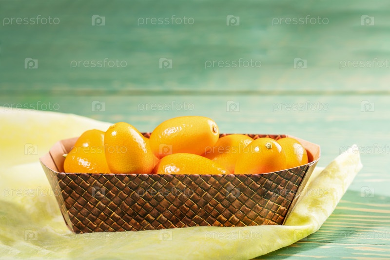 Маленькая коричневая картонная коробка с кумкватами на желтой ткани на зеленом деревянном фоне