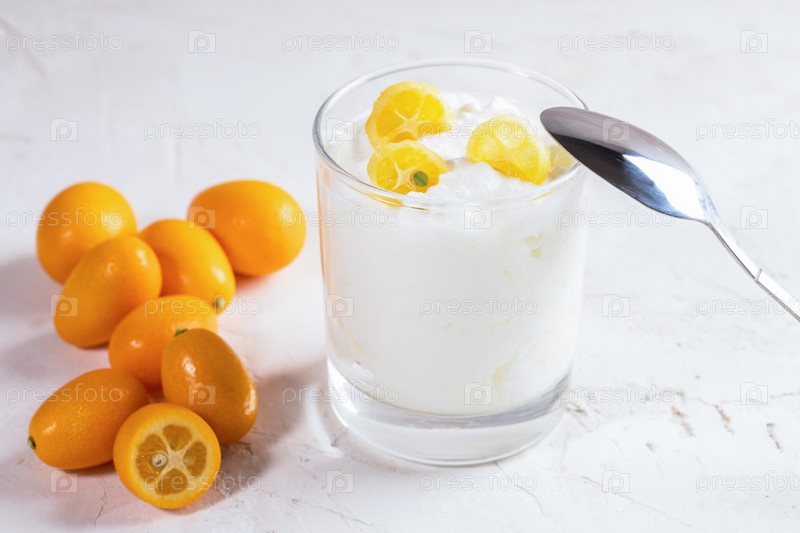 Йогурт с ломтиками кумквата в стакане с металлической ложкой и целыми фруктами на белом фоне