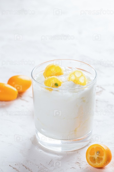 Стакан с йогуртом с кусочками кумквата на белом фоне