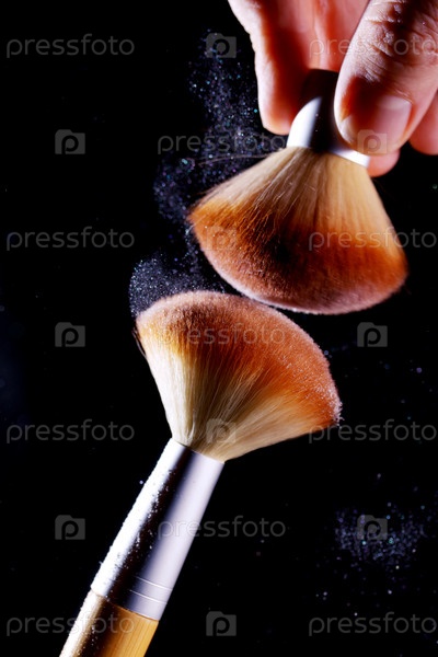 Две кисти для макияжа. Облако пудры на черном фоне. Крупный план
