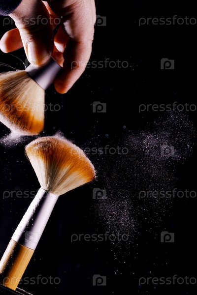 Две кисти для макияжа. Облако пудры на черном фоне. Крупный план