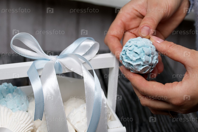 Конусы зефира. Зеогир домашний. Женщина кладет его в деревянную декоративную коробку. На фоне досок. Крупный план