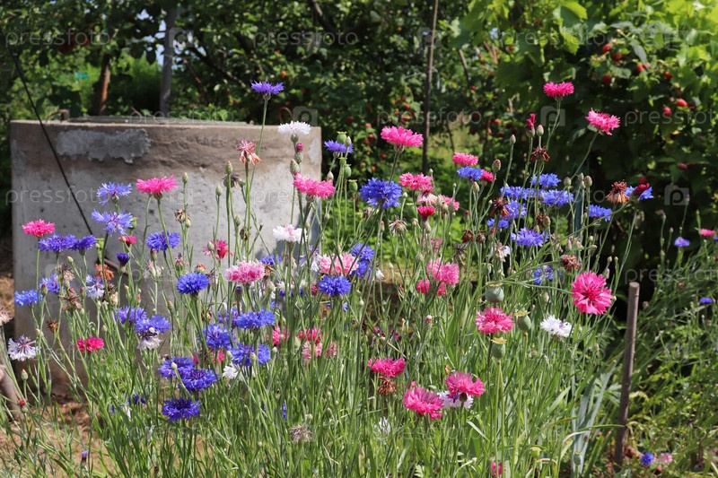 Фото клумбы с разноцветными васильками в саду на фоне колодца в деревне летом