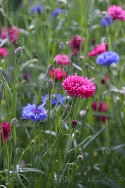 Цветущие разноцветные васильки в деревне