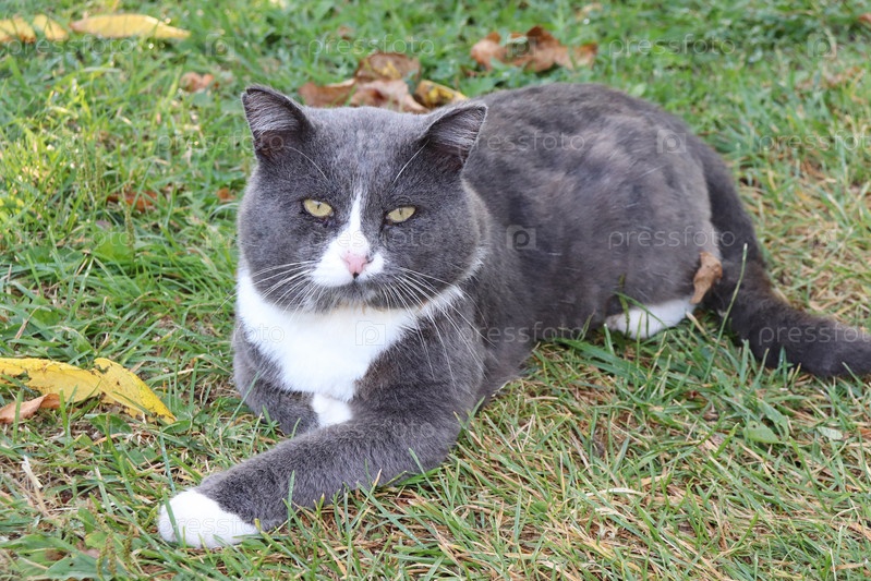 Серый кот лежит на траве и желтых опавших осенних листьях