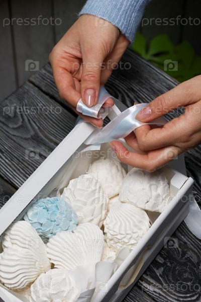 Конусы зефира. Зефир домашний. Упакован в деревянную декоративную коробку. Женщина завязывает ленту бантом. На фоне досок. Крупный план