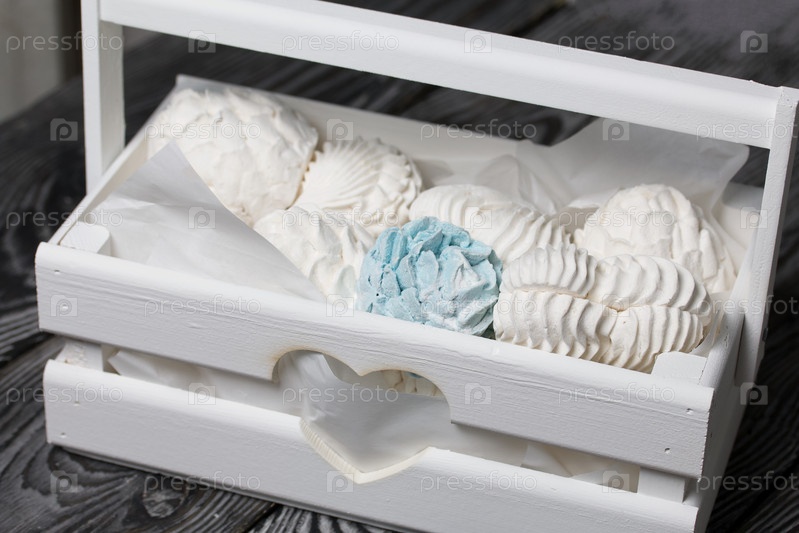 Конусы зефира. Зефир домашний. Упакован в деревянную декоративную коробку. На фоне досок. Крупный план