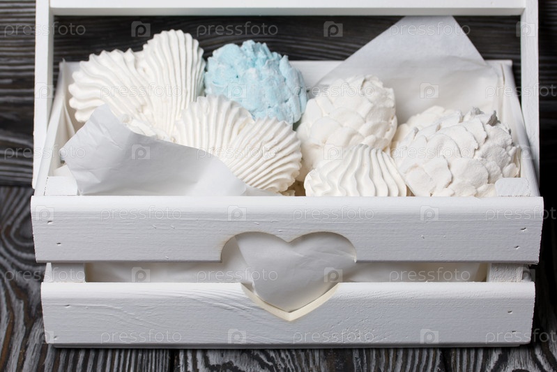 Конусы зефира. Зефир домашний. Упакован в деревянную декоративную коробку. На фоне досок. Крупный план