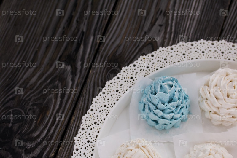 Конусы зефира. Зефир домашний. Разложил на блюде. На фоне досок. Взято сверху