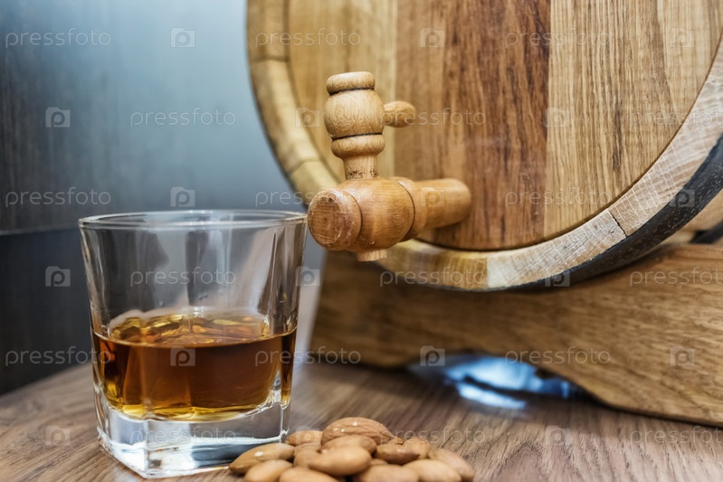 Небольшая деревянная дубовая бочка для домашнего производства и стопка выдержанного в ней виски