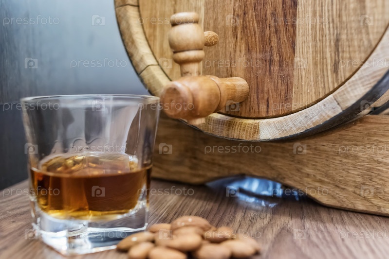 Небольшая деревянная дубовая бочка для домашнего производства и стопка выдержанного в ней виски