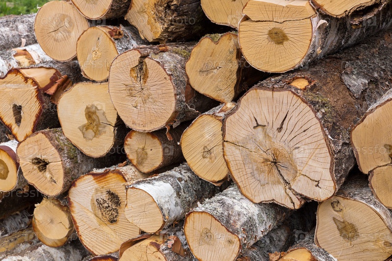 Куча березовых бревен. Фон из спиленных березовых бревен