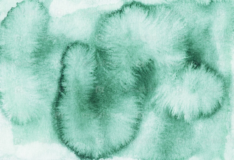 Акварельные изумрудные пятна на фоне белой бумаги. Ручной росписью