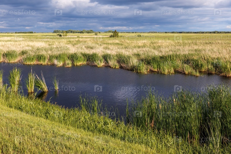 Болотный пейзаж. Вода и трава на фоне грозового неба. Вид на болото перед дождем