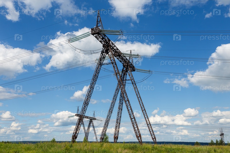 Столб электричества. Поддержка линии опоры высокого напряжения в полевых условиях