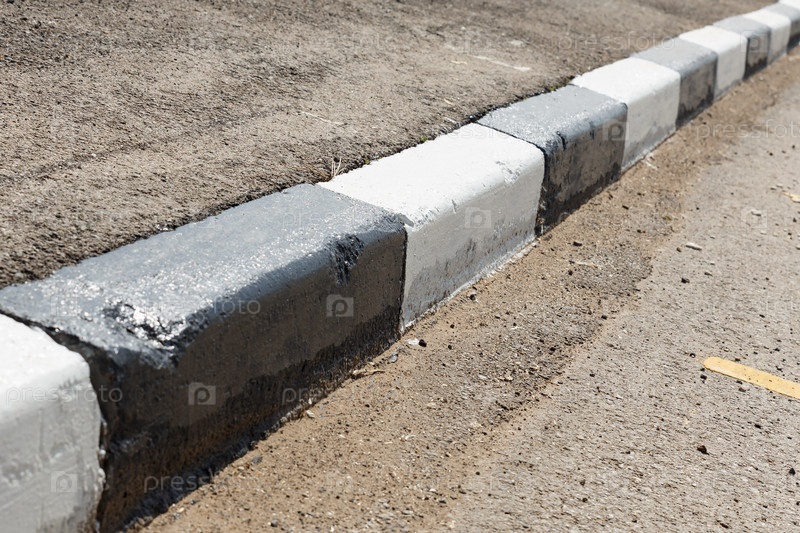 Черно-белая граница. Тротуар из бетонных блоков с черно-белым бетонным бордюром