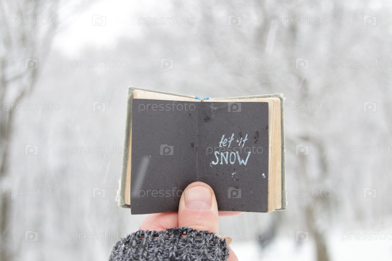 Пусть идет снег концепции. Рука держит буклет с надписью на фоне зимнего леса