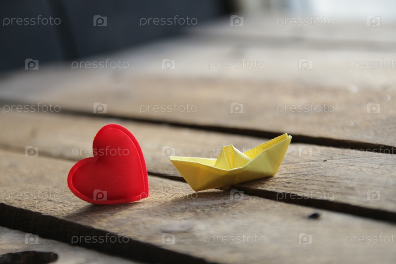 Красное сердце на деревянном фоне и бумажный кораблик. Место для текста. Валентин